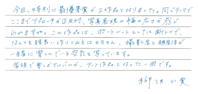 子供の成長を淡々と撮影したこの作品には、見送る母親の気持ち、そして、いつかはこの姿を見る事が出来なくなる切なさ。そして愛しさを感じました。それと同時に私を日々思いやる母への感謝、そして愛を思い出せてくれます。この子どもたちは大人になり、この写真集を手にとった時、母が自分たちの成長を見届ける温かいこの眼差しに気づく事が出来ると思います。そういう意味でも愛の表現として写真集を創る事は、花を贈る以上に素敵な行為かもしれません。