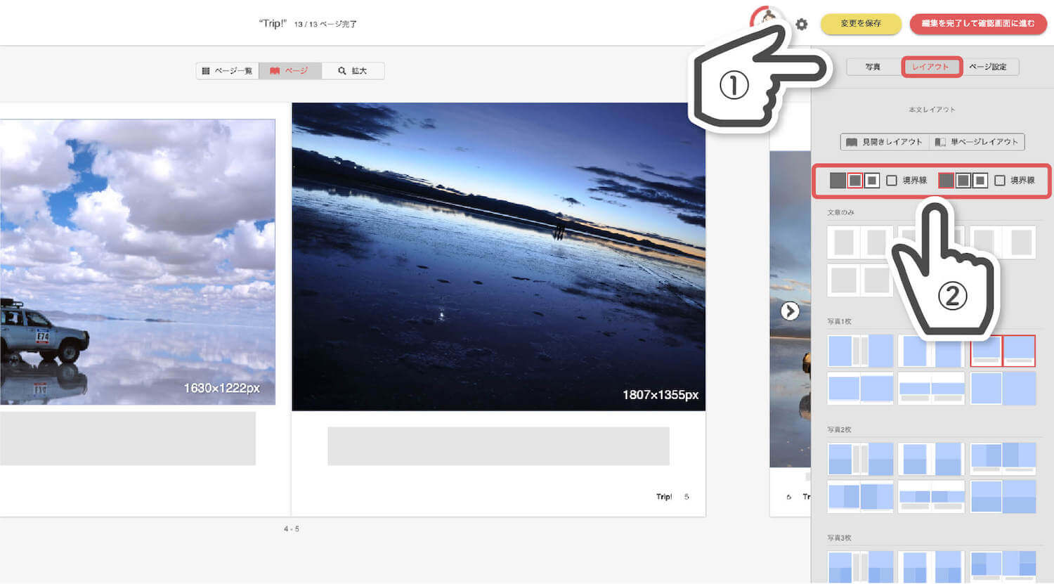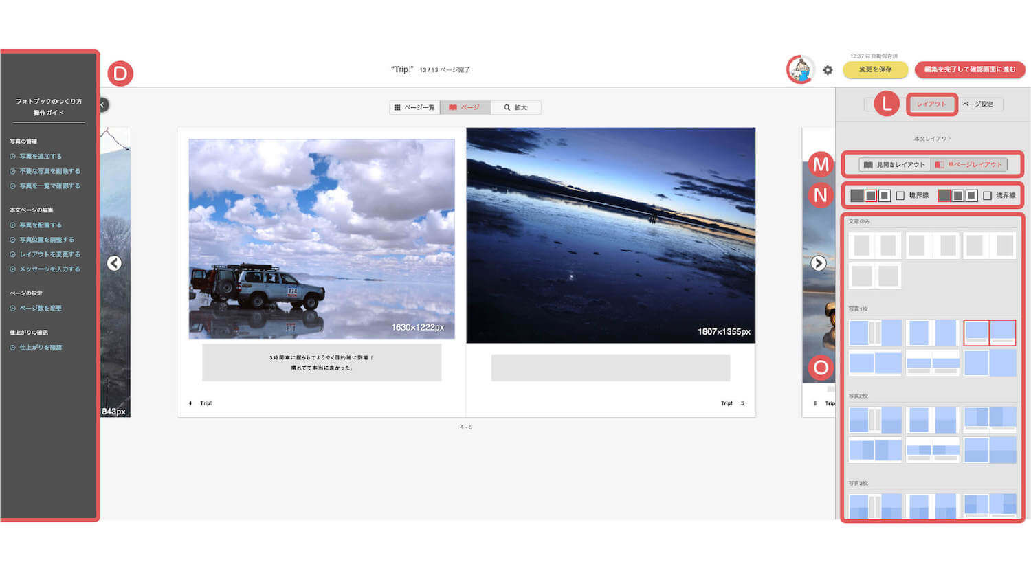 (D)ヘルプ 操作方法の説明を見ることができます。 (L)レイアウトタブ ページのレイアウト設定をすることができます。 (M)レイアウト選択 見開きレイアウトなのか、単一ページのレイアウトなのかを選ぶことができます。 (N)フレーム・境界線 左右ページのフレームの枠や、境界線を設定できます。 (O)ページレイアウト 左右のページのレイアウトを選択できます。テキスト部分がグレーで、写真部分がブルーになります。