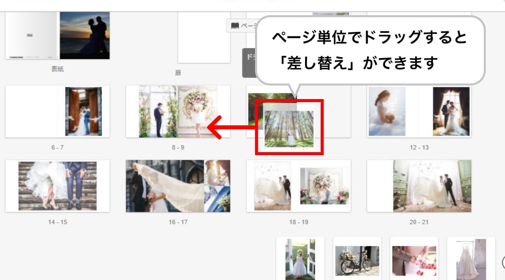 ドラッグ中のマウスの位置によって『割り込み』と『差し替え』が可能です。・ページ単位でドラッグ…『差し替え』