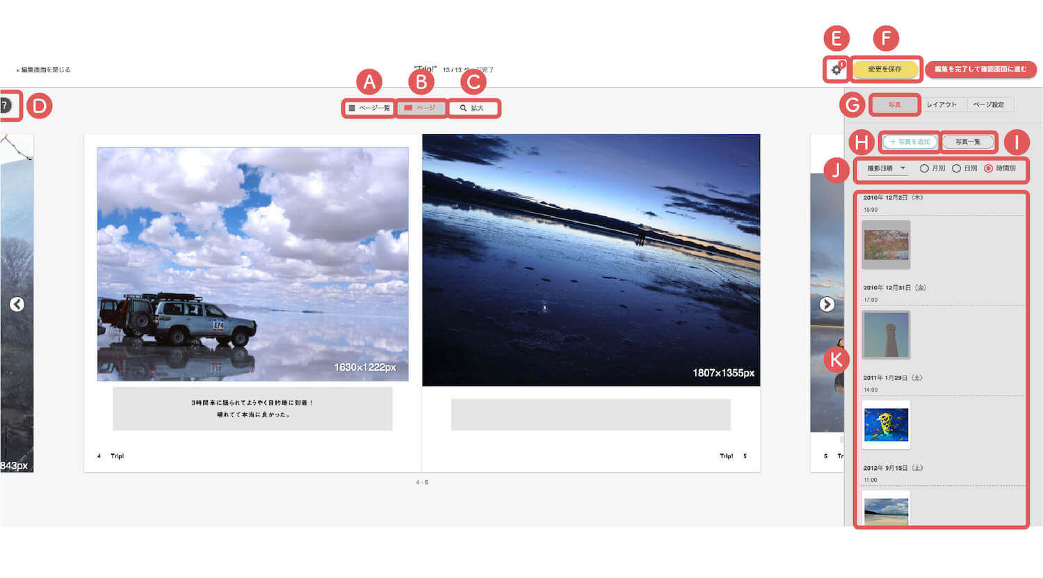 (A)ページ一覧タブ 全ページが一覧でご覧いただけます。 (B)ページタブ ページごとに編集ができます。 (C)拡大 ページを拡大できます。 (D)操作ガイド 操作方法の説明を見ることができます。 (E)設定ボタン 写真撮影日の自動入力設定やテーマの設定を行うことができます。 (F)変更を保存 クリックした時点までの編集情報が保存されます。※保存は3分毎に自動で行われます (G)写真タブ アップロードした写真を確認したり、表示されている写真をドラッグしてページに配置することができます。 (H)写真を追加 パソコン・タブレット内にある写真をアップロードすることができます。 (I)写真一覧 撮影順、追加日時順、名前順に並び替えることができたり、入れたい写真にクリックすると、その写真の場所を表示してくれます。 (J)並び替え設定 写真の並び替えを行うことができます。 (K)写真 アップロードした写真が一覧で表示されます。写真をドラッグしてページに配置することができます。