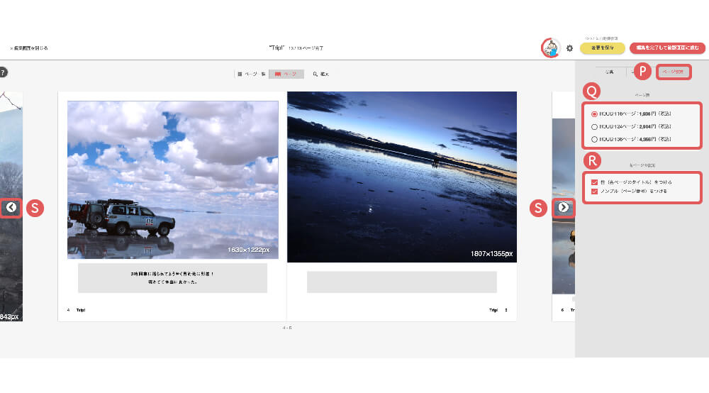 (P)ページ設定タブ ページ数の変更や、柱・ノンブルの設定ができます。 (Q)ページ数変更 選んだアイテムのページ数を変えることができます。 (R)各ページの設定 柱・ノンブルをつけるかどうかを選ぶことができます。 (S)ページ送りボタン 矢印ボタンをクリックすると前後のページに移動ができます。